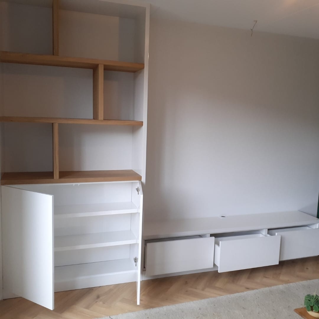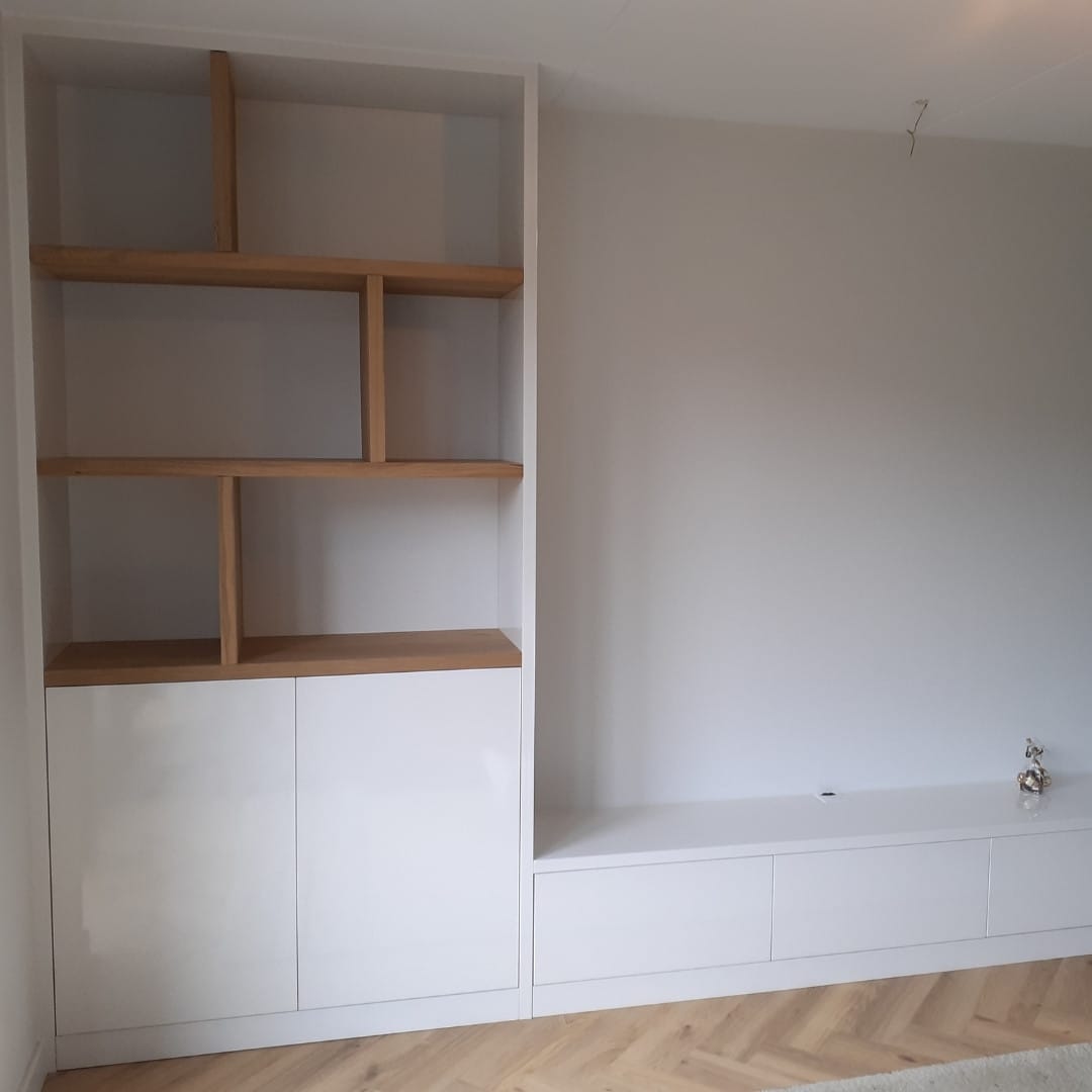 Voor dit project is een op maat gemaakt tv-meubel gecombineerd met een praktische vakkenkast. Het meubel vormt het centrale punt van de woonkamer: een stijlvolle plek voor de televisie én tegelijk een slimme oplossing voor extra opbergruimte. Door de strakke lijnen en de slimme indeling ontstaat een meubel dat zowel functioneel als decoratief is.