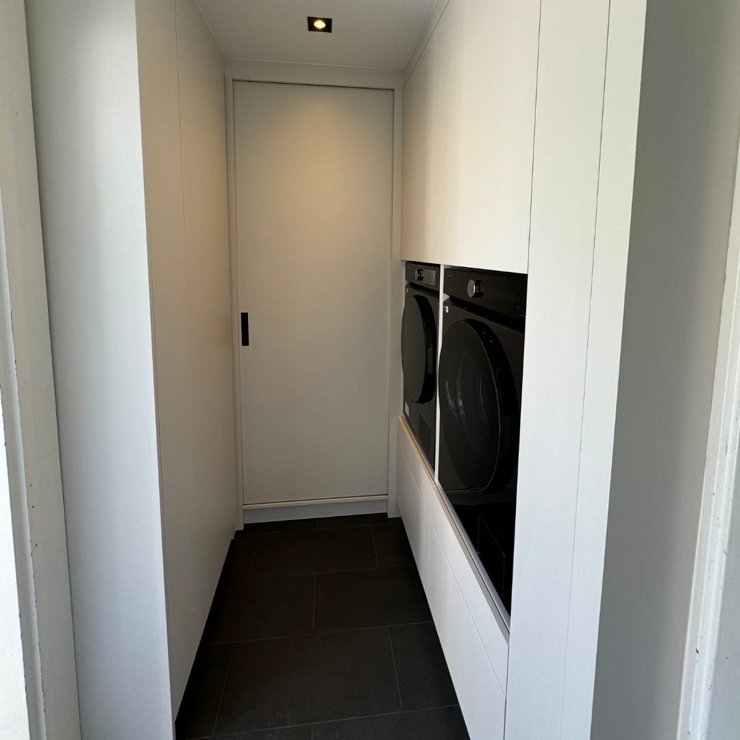Voor dit project is een maatwerk wasmachine meubel ontworpen en gebouwd. Het doel was om de wasruimte functioneler en strakker te maken door de wasmachine netjes in het meubel te integreren. Het meubel is volledig afgestemd op de afmetingen van de ruimte en de apparaten, waardoor er een opgeruimde en stijlvolle uitstraling ontstaat.